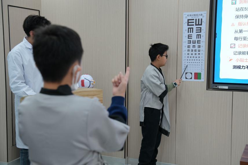 在医务人员指导下,小朋友们体验互相检测视力。石梦竹 摄