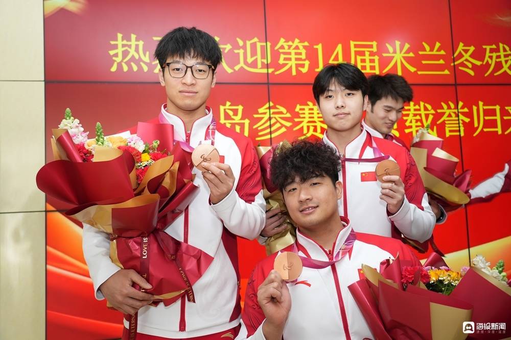 3月19日下午,由青岛市承训的中国残奥冰球队,在斩获2026年意大利米兰冬残奥会冰球项目铜牌后载誉回青。