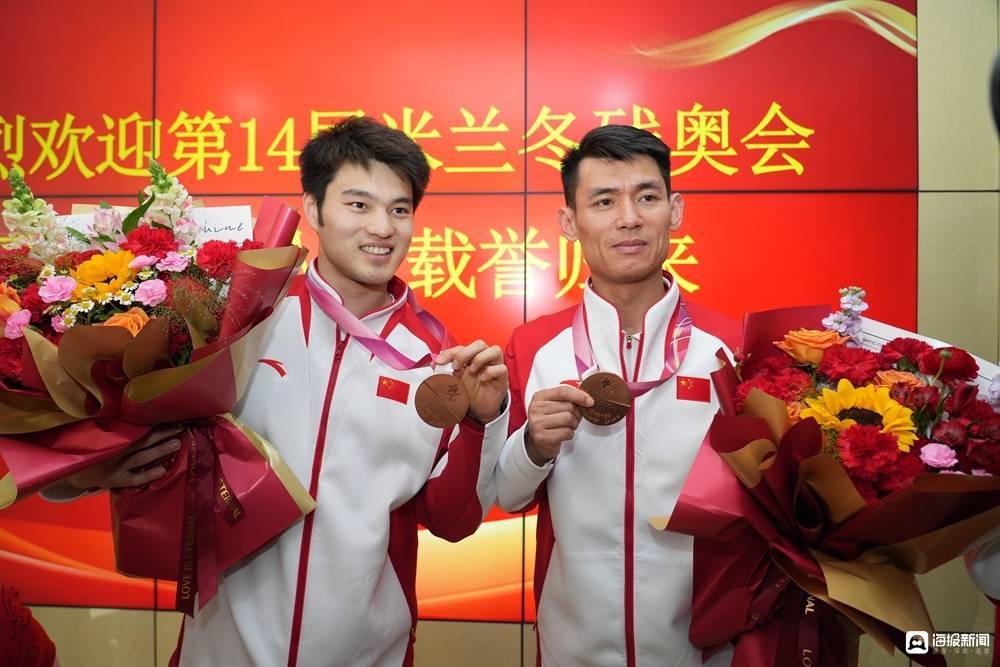 中国残奥冰球队队长汪之栋(左)和前队长崔玉涛(右)向记者展示奖牌。